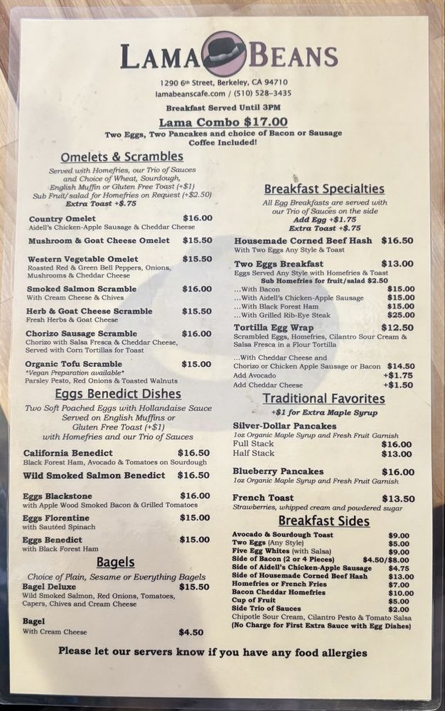 Introducing the menu at Lama Beans Cafe, a Women-owned cafe located in Berkeley, CA. This cozy spot offers a variety of New American, Seafood, and Breakfast & Brunch options, with Vegan choices available. From traditional favorites like Bagel Deluxe and Blueberry Pancakes to flavorful Omelets & Scrambles such as Chorizo Sausage Scramble and Herb & Goat Cheese Scramble, there is something for everyone to enjoy. The Breakfast Specialties like Housemade Corned Beef Hash Breakfast and Tortilla Egg Wrap Breakfast are sure to satisfy any craving. With a full bar, free Wi-Fi, and gender-neutral restrooms, Lama Beans Cafe provides a welcoming and inclusive environment for all customers. Visit for a delicious meal and a relaxing dining experience.